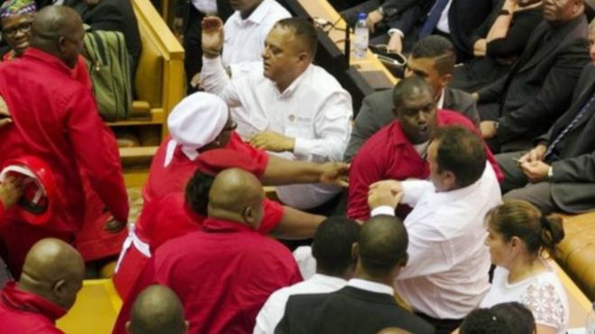 Bunge la Afrika kusini liligeuka kuwa uwanja wa <endelea bofya kichwa cha habari hii juu>vita ambapo wabunge wa upinzani ilifikia hatua ya kuvutana mashati na maafisa wa usalama na kufanya wabunge wa upinzani wa chama cha Economic Freedom Fighters (EFF) wakiongozwa na Julias Malema kutolewa nje ya ukumbi wa bunge kwa nguvu na baadae wabunge wengine wa upanzani nao wakatoka nje ya ukumbi.