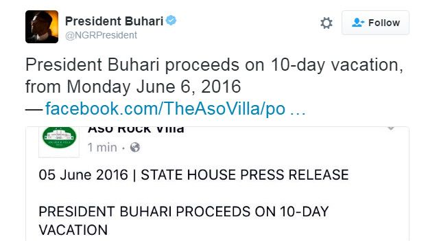 Rais Muhammadu Buhari wa Nigeria amechukuwa likizo ya siku 10 ilikupata matibabu maalum nchini Uingereza.